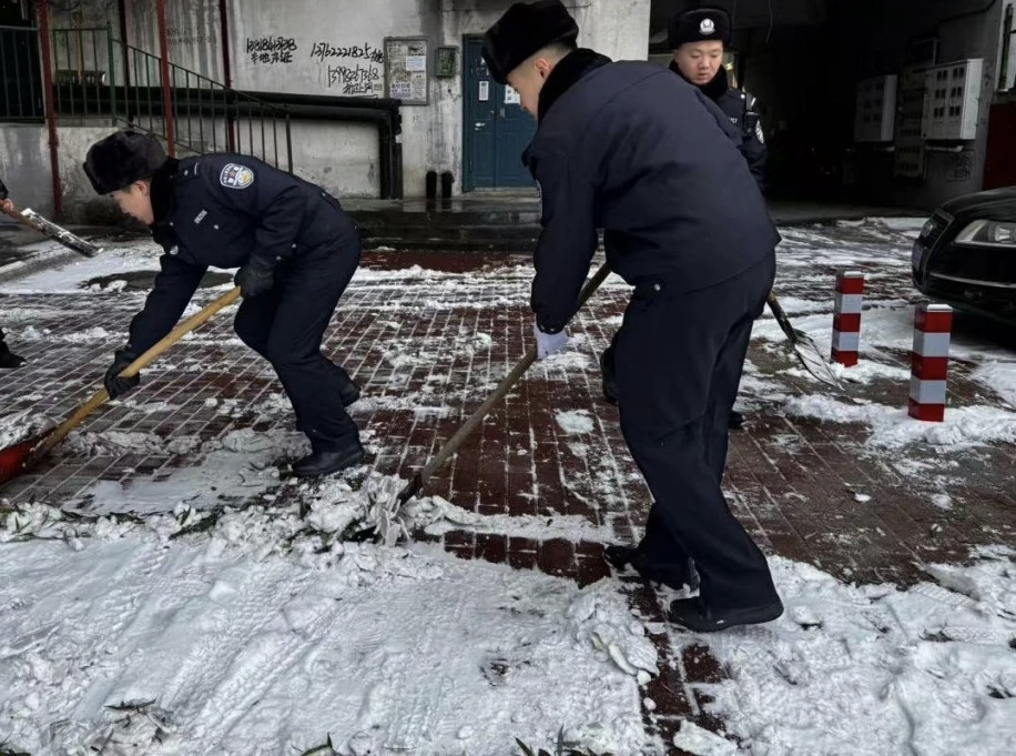 降雪过后因早晚温差较大,融雪逐渐结冰,小区道路、单元门前湿滑难行,给居民出行带来了极大的安全隐患。大家按照“破冰清障、路面清扫、安全疏导”分工协作,重点攻坚易滑区域。同时,提醒出行居民“路面湿滑、缓步慢行”,用细节传递着警民温情。
