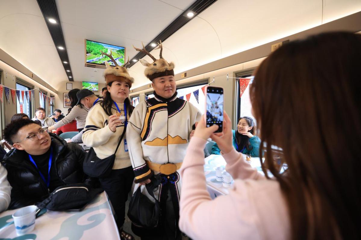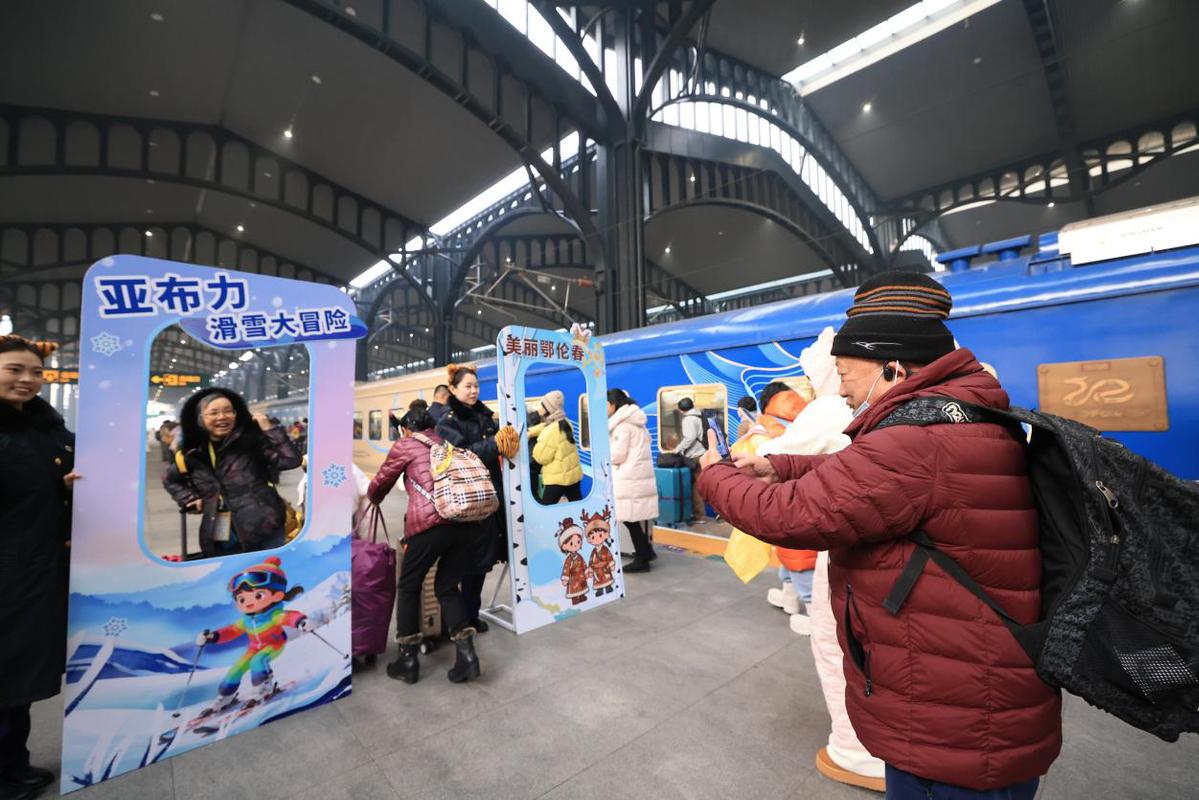 11月26日8时,来自长三角、珠三角地区的300余名游客在哈尔滨站登上Y783次“悠享龙江·银旅号”旅游列车,开启为期6天的“找北”之旅。该趟列车是中国铁路哈尔滨局集团有限公司(以下简称“哈尔滨局集团公司”)今冬开行的首趟高品质冰雪旅游列车。