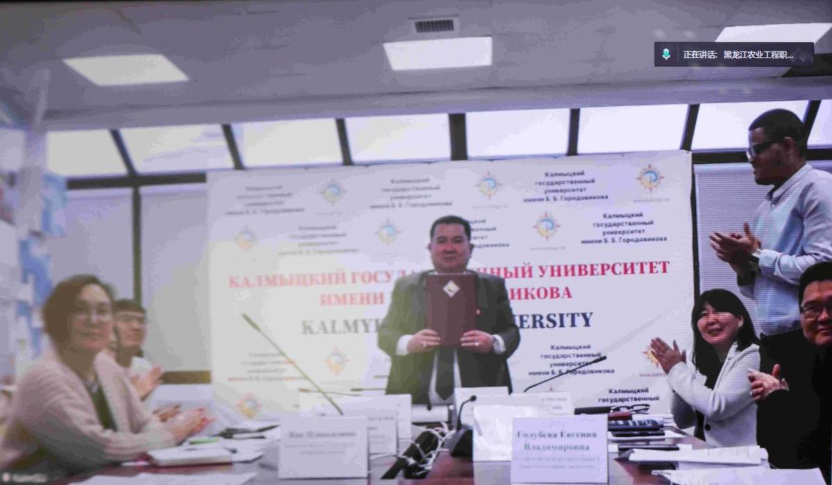 12月29日,黑龙江农业工程职业学院与俄罗斯卡尔梅克国立大学举行中外合作办学项目线上签约仪式。黑龙江农业工程职业学院校长张永强、副校长王新年,卡尔梅克国立大学校长萨拉耶夫・巴德玛・卡蒂诺维奇、国际关系副校长奥克萨娜・尼古拉耶芙娜・科涅娃、教学副校长拜拉・亚历山德罗芙娜・纳季罗娃,以及两校相关部门负责人出席仪式,共同见证两校合作迈入实质性阶段。