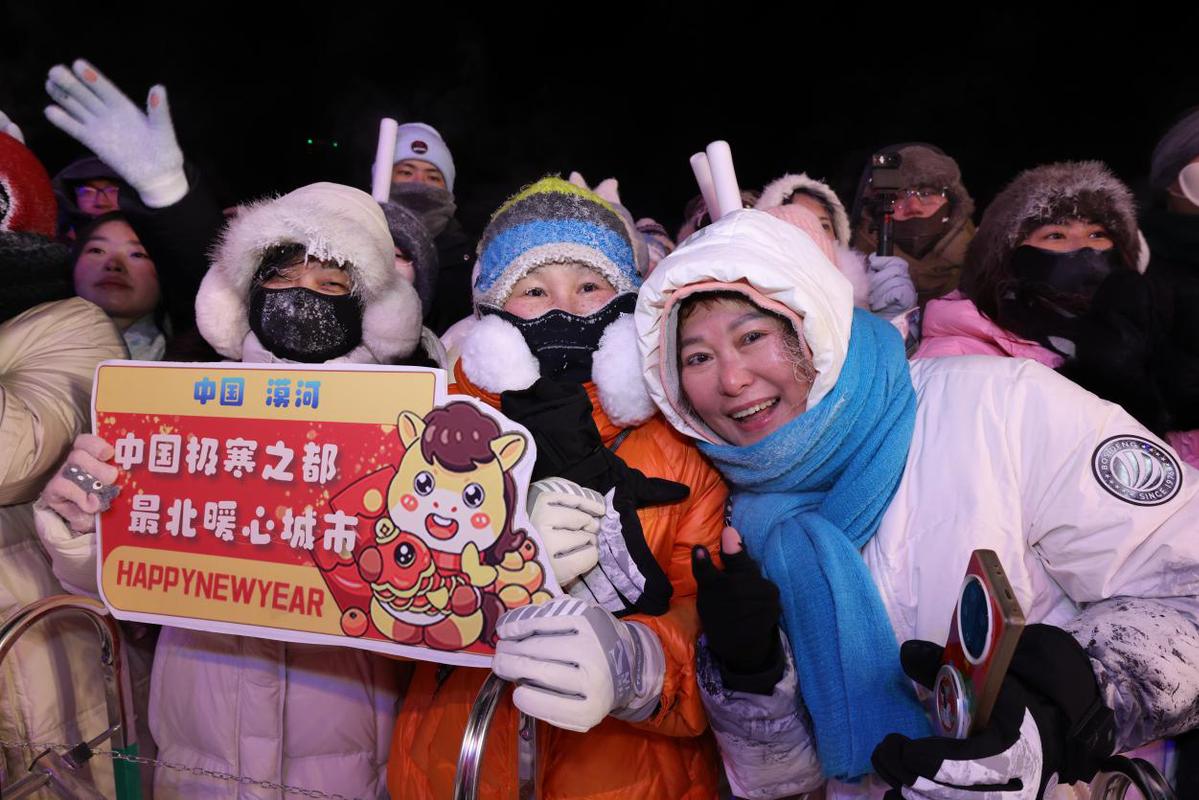 室外的极寒暖心市集烟火气十足,烤地瓜、烤串等特色摊位香气四溢,免费的姜茶、鱼汤、暖贴也让游客在寒冷中感受到贴心暖意。千人饺子宴也是跨年夜的暖心重头戏,游客们品尝用漠河本地出产的面粉、酸菜、猪肉制作的热腾腾饺子,了解漠河最新推出的4条精品旅游路线,感受“更岁交子、团圆安康”的美好寓意。“在这里的跨年氛围非常热闹,年味很足,这里的人非常热情,还发了暖宝宝,给大家煮饺子吃,天很冷,但心里暖暖的。”来自海南的游客钟意说。