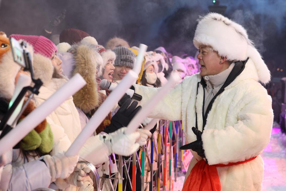 潮流与民俗的碰撞让跨年夜更具看点,《泼洒梦想》《要爱你就来》等歌舞表演点燃全场热情,荧光棒点亮夜空。随后,《小拜年》等东北二人经典选段轮番登场,演员们手持手绢、扇子载歌载舞,现场欢声笑语弥漫。“第一次在这么冷的地方跨年,热情可以把整个场子都点燃。”来自山东的游客陈佳欣兴奋地说。