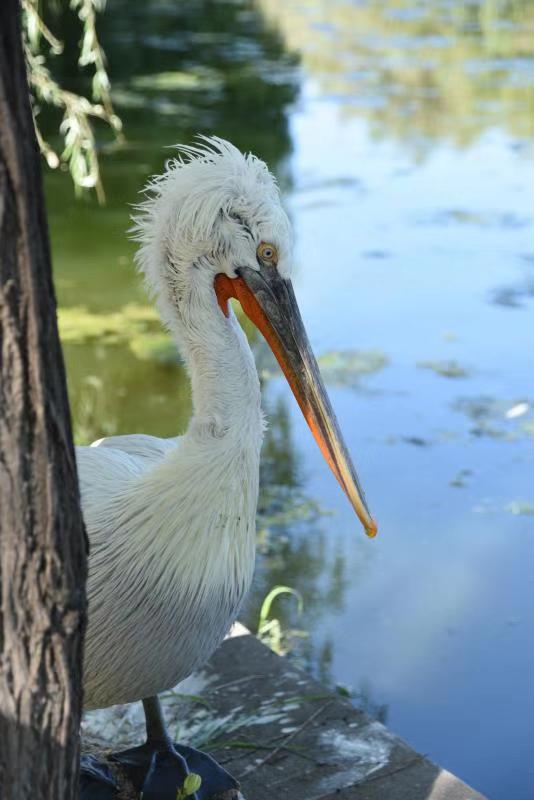 北方森林动物园的天鹅湖连着荷花湖,盛开的荷花被天鹅湖的居民非洲来的大鹈鹕“老醍”和一群今年春季出生的小斑嘴鸭同时相中,几乎同事迁居到到此。本以为来自非洲、在鹈鹕群中不太合群,脾气不好的“老醍”会用他压倒野鸭的庞大体型和大嘴驱逐这些吵吵闹闹的小家伙,没想到他们居然相处的十分和谐。鹈鹕喜欢吃鱼,在湖里专门挑大鱼,而他不屑一顾的小鱼就成了小野鸭们的美食,看着欢快的小鸭子,“老醍”心情似乎不错。吃饱喝足心情好的时候,他不像之前那样找个角落做傲娇的沉思装,而是假装不经意地游向小鸭子,路过之后转一圈再回来,乐此不疲,十分有趣。小斑嘴鸭们也从一开始的恐惧、好奇、躲避,到现在的镇定自若,该吃吃、该玩玩、该睡睡,就当多了一位免费“大嘴保镖”,从此妈妈再也不用担心我被欺负了。这群斑嘴鸭大约有十一、二只,它们成群结队,白天在湖内觅食玩耍,晚上在荷叶丛中休息。现在有了“大嘴保镖”更觉安全,俨然将荷花湖当成了自己的家,一群鸭在此生活的其乐融融,流连忘返。荷花湖经常可以看到大鹈鹕在荷花下捕鱼,野鸭在荷叶下睡觉的温馨场景,吸引众多游客围观。