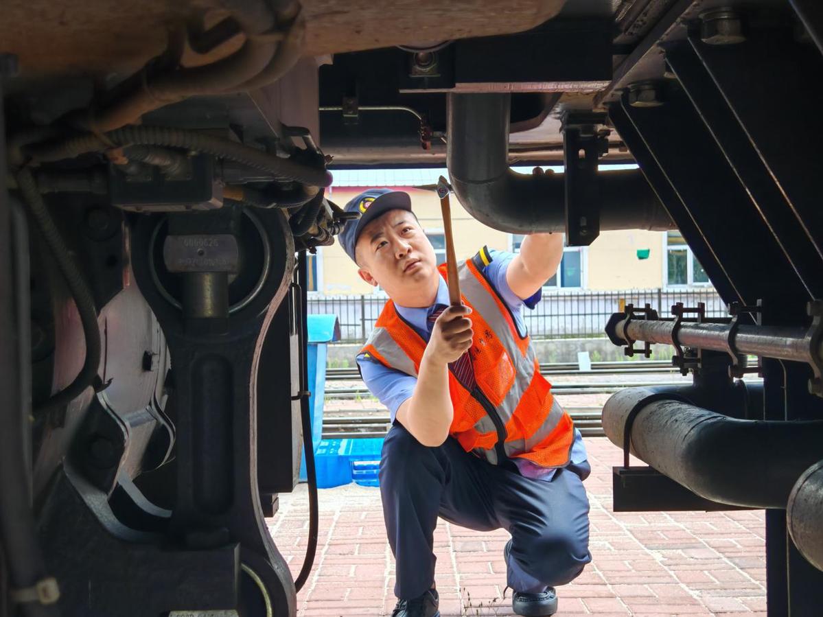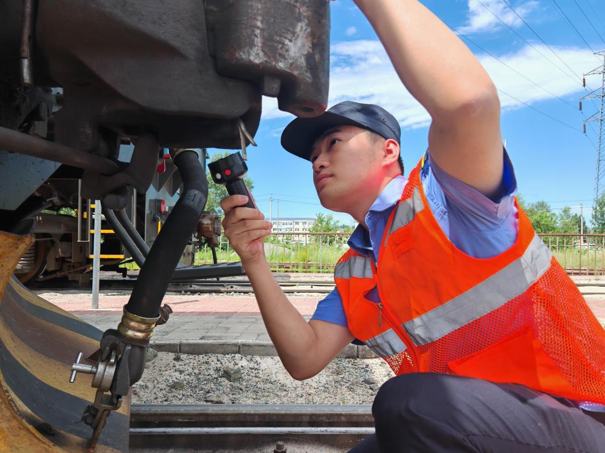 “汛期行车,砂管必须通畅。”7月15日14时25分,齐齐哈尔机务段整备线15道,8161号“黄继光号”机车静立待发。司机陈继良手持检点锤,轻触砂管检查牢固度,凝神观察出砂情况。在雨季,列车穿行高坡大岭,轮轨极易发生空转,机砂带来的摩擦力是行车安全的坚实保障。
