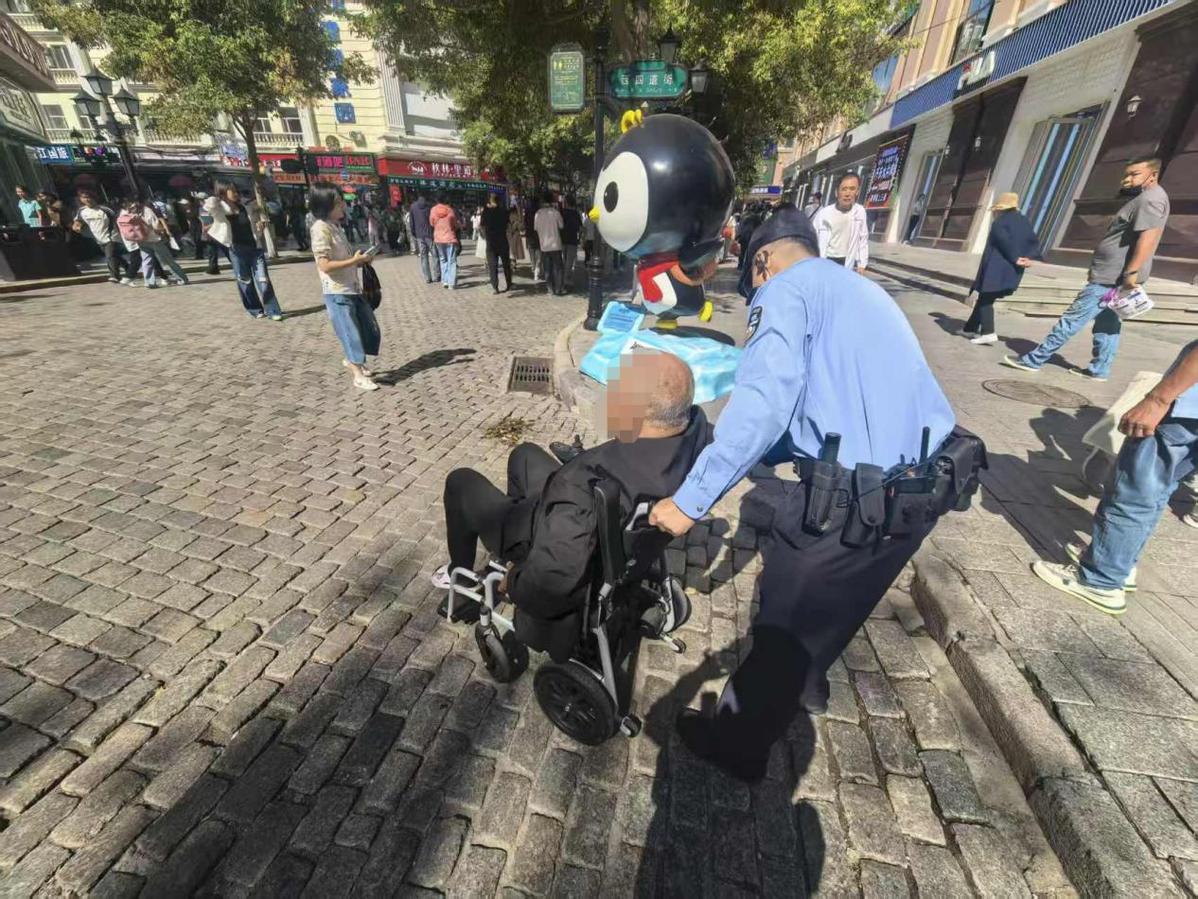 “老人家,您没事吧?慢点起!”2025年9月13日11时33分,巡逻警力赵一澎、张燚鑫正在中央大街开展日常巡逻,突然发现前方一名坐轮椅的老人不慎侧翻摔倒在地。两人立即快步上前,小心翼翼地将老人从地上扶起,同时仔细查看老人身体状况。“谢谢你们啊小伙子,刚才没坐稳就摔了,这腿也使不上劲。”老人有些不好意思地说。赵一澎一边帮老人调整轮椅位置,一边询问:“您家离这远吗?我们送您回去吧,这样您一个人走我们也不放心。”得知老人住处就在附近街区后,张燚鑫推着轮椅,赵一澎在旁护送,稳稳当当地将老人送到家附近。临别时,老人紧紧握着民警的手再三感谢,赵一澎笑着回应:“您客气了,这是我们应该做的,以后出门记得多留意,有困难随时找我们。”
