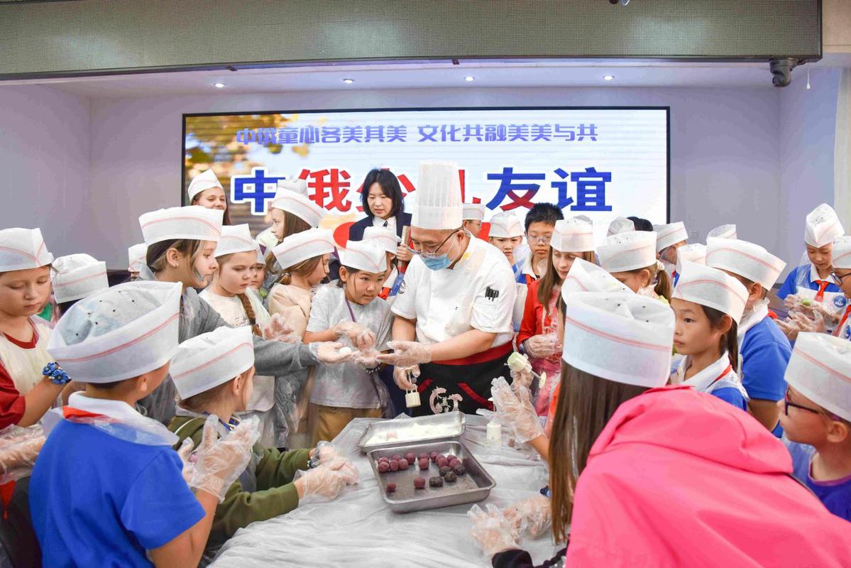 当天下午,东风小学的孩子们在校门口分列两侧,手中挥舞着鲜艳的五星红旗,用热烈的掌声和灿烂的笑容,迎接远道而来的俄罗斯小客人们,简单的欢迎仪式后,中俄小朋友互赠“手”望相助环,象征着中俄两国年轻一代紧密相连的心。在老师的耐心指导下,中俄小朋友一起揉面、包馅、塑形,共同制作冰皮月饼,把对彼此的祝福都藏进这软糯的美味里,在动手的过程中,感受中国传统美食的魅力。三年三班的学生谭雨格兴奋地说:“今天我特别高兴,与俄罗斯的小朋友们一起做月饼,让他们了解我们的传统节日,我希望他们能经常来鸡西玩,虽然语言不一样,但是笑容是一样的。”