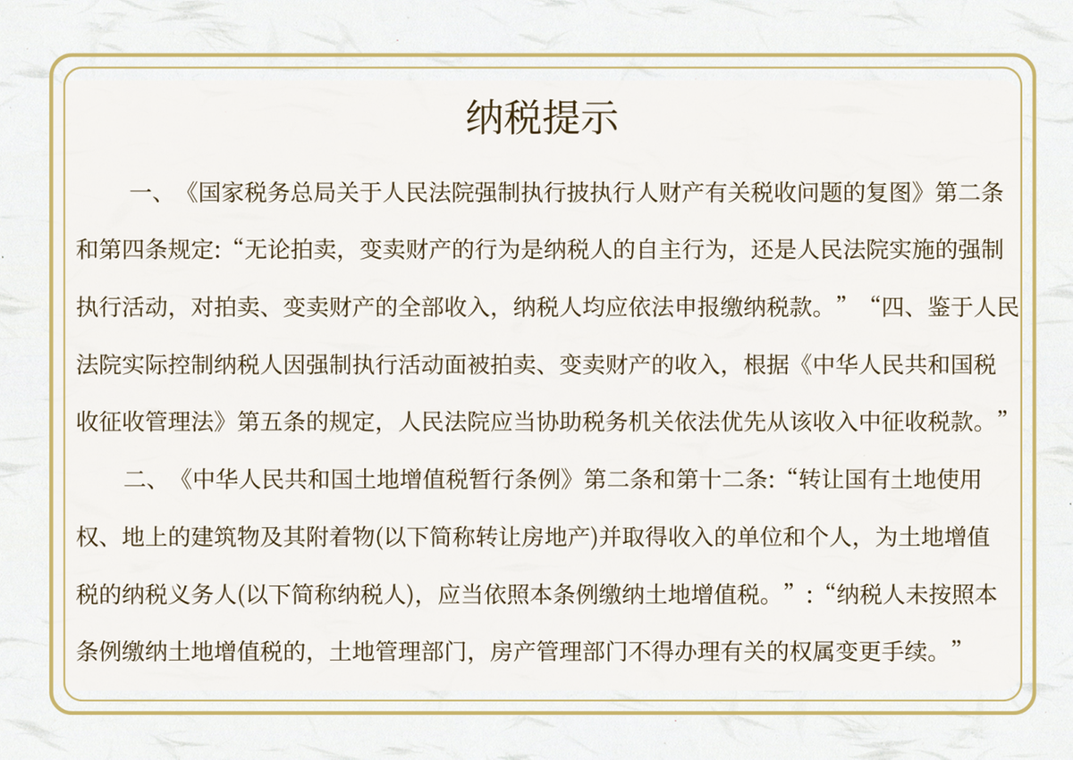 一是法拍房案件纳税提示模板。围绕法拍房交易中当事人最关心的“缴什么税、缴多少、怎么缴”问题,明确买受人需缴纳的契税、印花税;同时列明出卖人应承担的增值税、城市维护建设税、教育费附加及个人所得税等。并特别提示纳税义务发生时间及申报期限,以及未按期纳税的滞纳金和罚款风险。