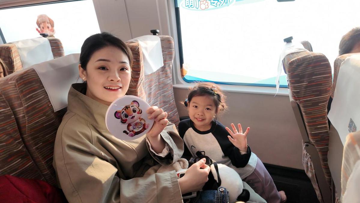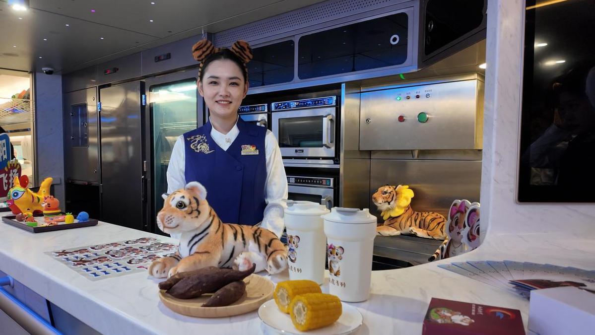 车厢内,特色功能区为旅客提供了丰富的文化互动。“东北虎非遗馆”邀请剪纸艺人现场教学,旅客可亲手制作虎形窗花;造型可爱的虎形手办、虎纹饼等泥塑也备受青睐。乘务人员佩戴虎形徽章,随车讲解科普知识,并组织互动活动,旅途氛围温馨愉悦。