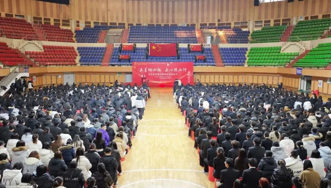 2025年11月12日,学校在体育馆内隆重举行“五星映四极,赤心照山河——从五面国旗读懂强国使命担当”主题升旗仪式暨“国旗下的思政课·场馆里的思政课”。校党委副书记、工会主席郭砾,党委常委、宣传部(党委教师工作部)部长张艳君,党委常委、组织部部长王羽,学生工作部(学生处、武装部)、校团委、学生就业指导处等相关职能部门负责人,各学院党委副书记、辅导员及千余名学生共同参与,沉浸式聆听这场铸魂润心、励志笃行的思政大课。仪式由校团委书记刘春玲主持。
