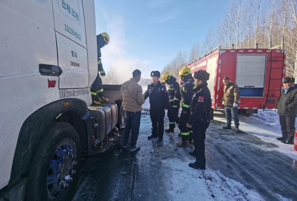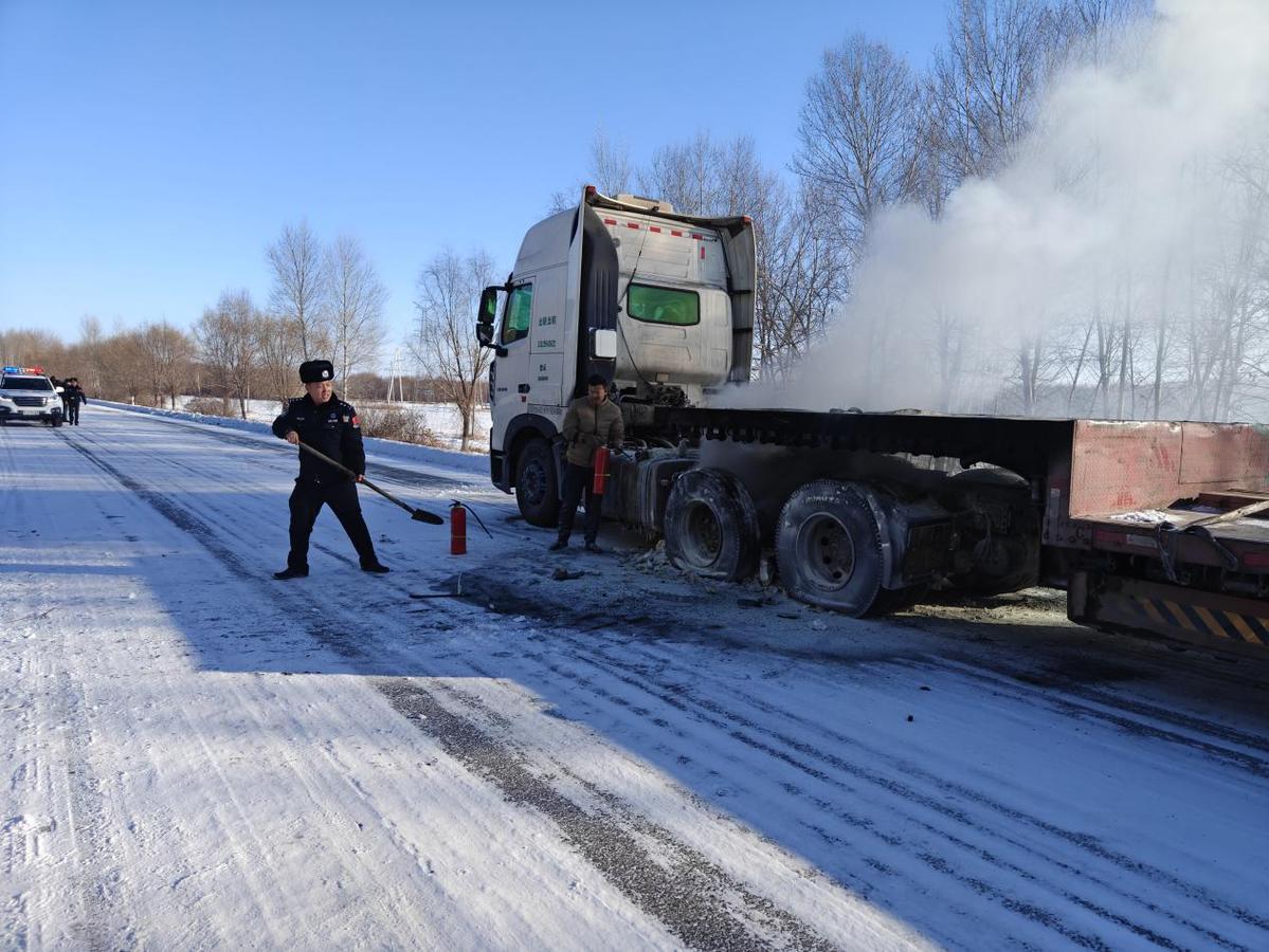 11月28日9时30分左右,佳木斯边境管理支队浓桥边境派出所接到群众王某来所报警求助称,在102国道寒葱沟路段,一辆17.5米大挂车车轮处因车轮制动系统故障而起火燃烧,已经蔓延至主油箱附近,情况万分紧急。