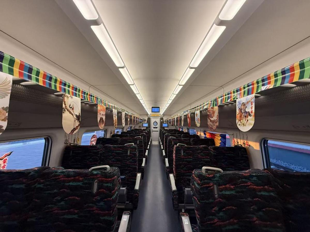 为彰显民族特色,列车精心打造了朝鲜族风情主题车厢。红彤彤的朝鲜族特色窗花、印有朝鲜族民俗图案的挂画、精巧的民族特色挂件,将车厢装扮得别具一格,浓郁的朝鲜族风情扑面而来。不少旅客步入车厢后,纷纷拿出手机拍照打卡,列车餐车区域设置的主题打卡墙,更是成为旅客合影留念的热门地点,成为旅途中的一道独特风景线。