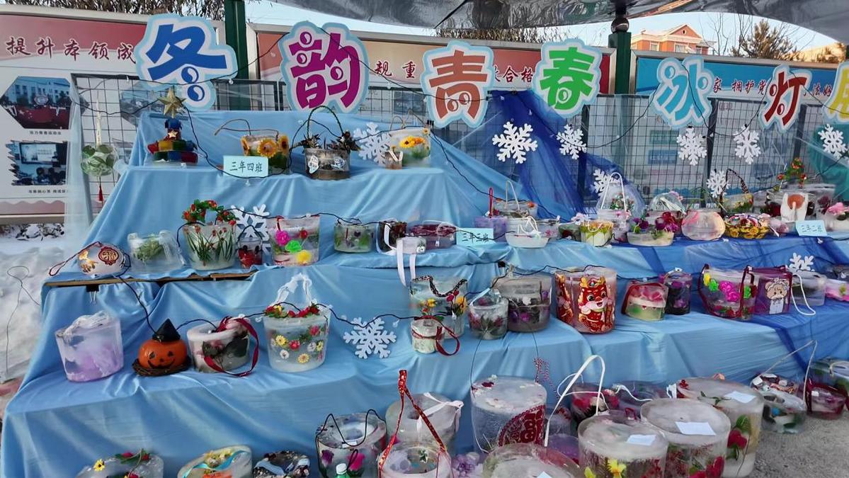 操场西侧的篮球场上,雪地化作巨大的画布。学生们手持彩色喷漆罐,在洁白的雪面上挥洒创意。有的勾勒出憨态可掬的雪人,有的描绘出北国风光的壮丽,还有的创作出抽象的冰雪图腾。一盏盏学生亲手制作的冰灯更显匠心独运,造型各异、流光溢彩,不仅展示了孩子们的才艺,更传递出他们对冰雪文化的深刻理解与热爱。