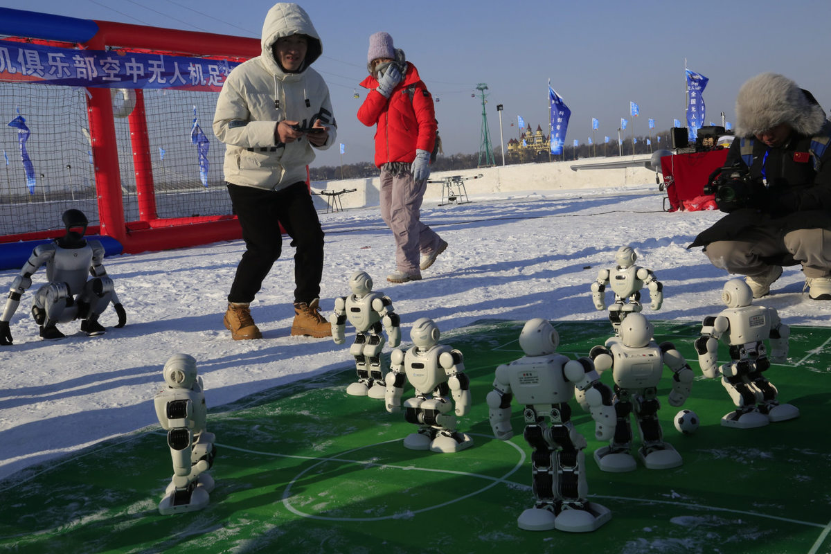 在智慧冰雪互动区,机器人足球赛和无人机足球赛是最大亮点。智能机器人在冰面上灵活穿梭,完成带球、传球、射门等动作;无人机在特制笼球内展开激烈攻防,展现科技与体育的完美融合。